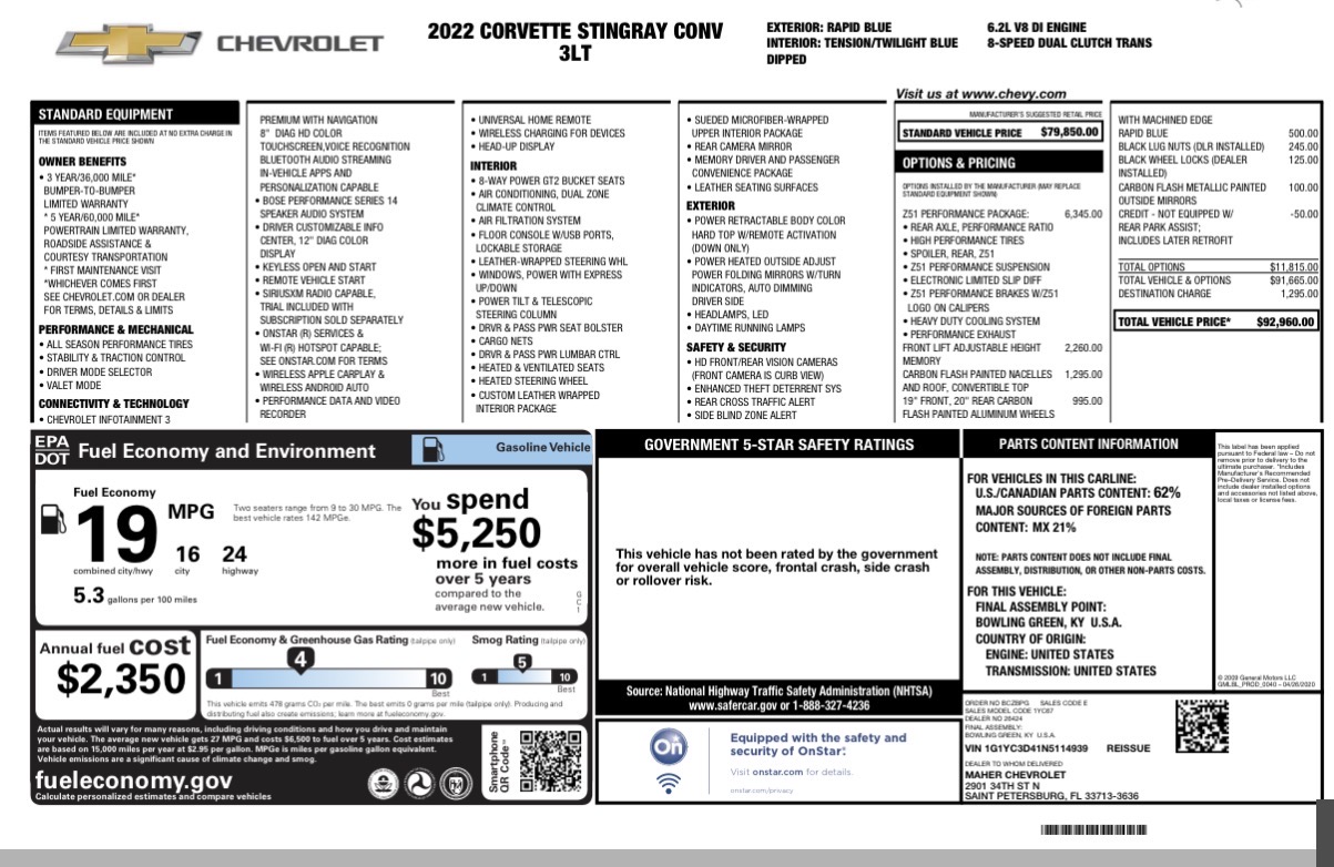 Beautiful Blue on Blue 2022 Corvette 3Lt Hard Top Convertible with all the goodies including –